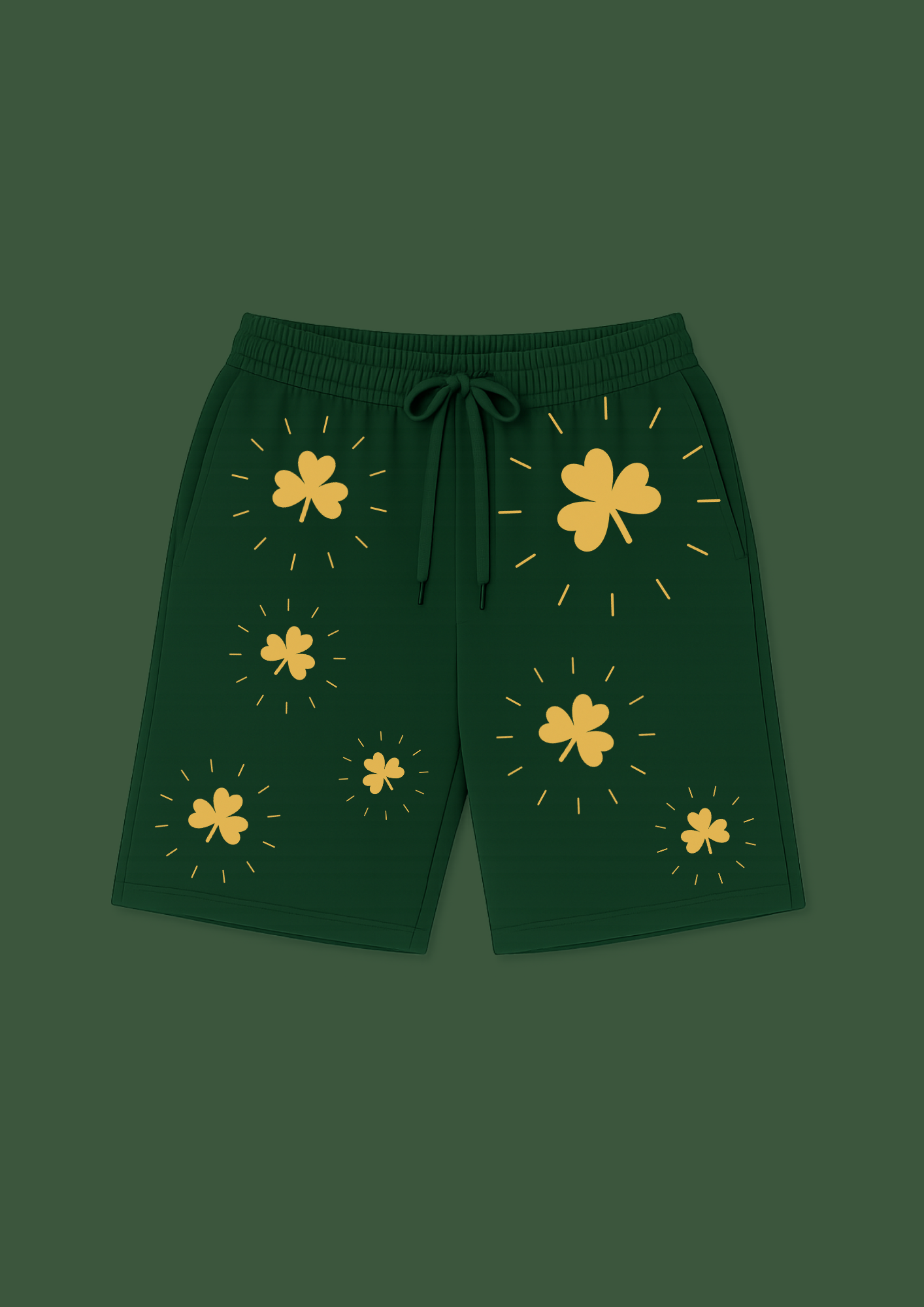 Exklusive Shorts in Dunkelgrün mit gelben Kleeblättern.
