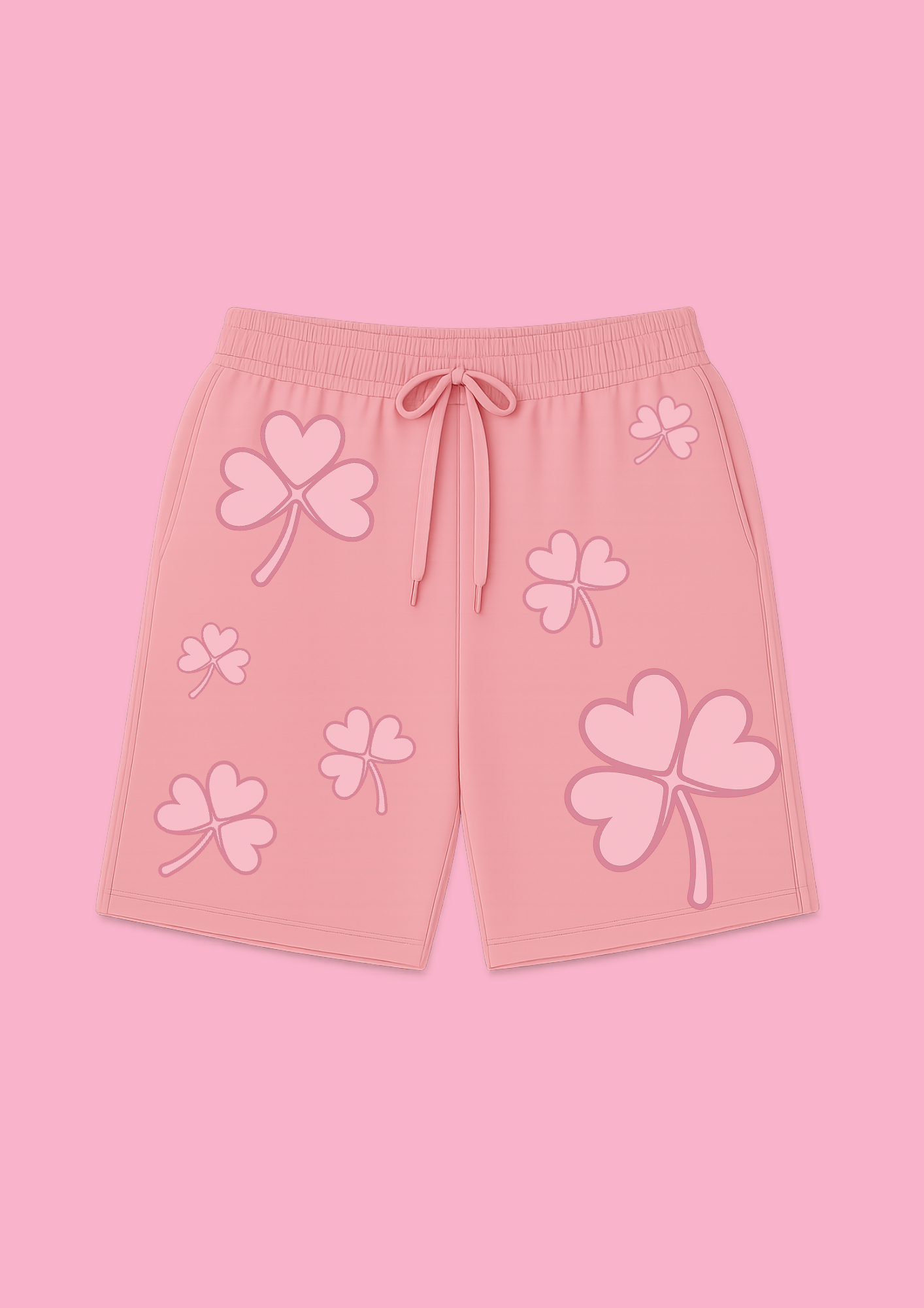 Exklusive Shorts in Pink mit weißen Kleeblättern.