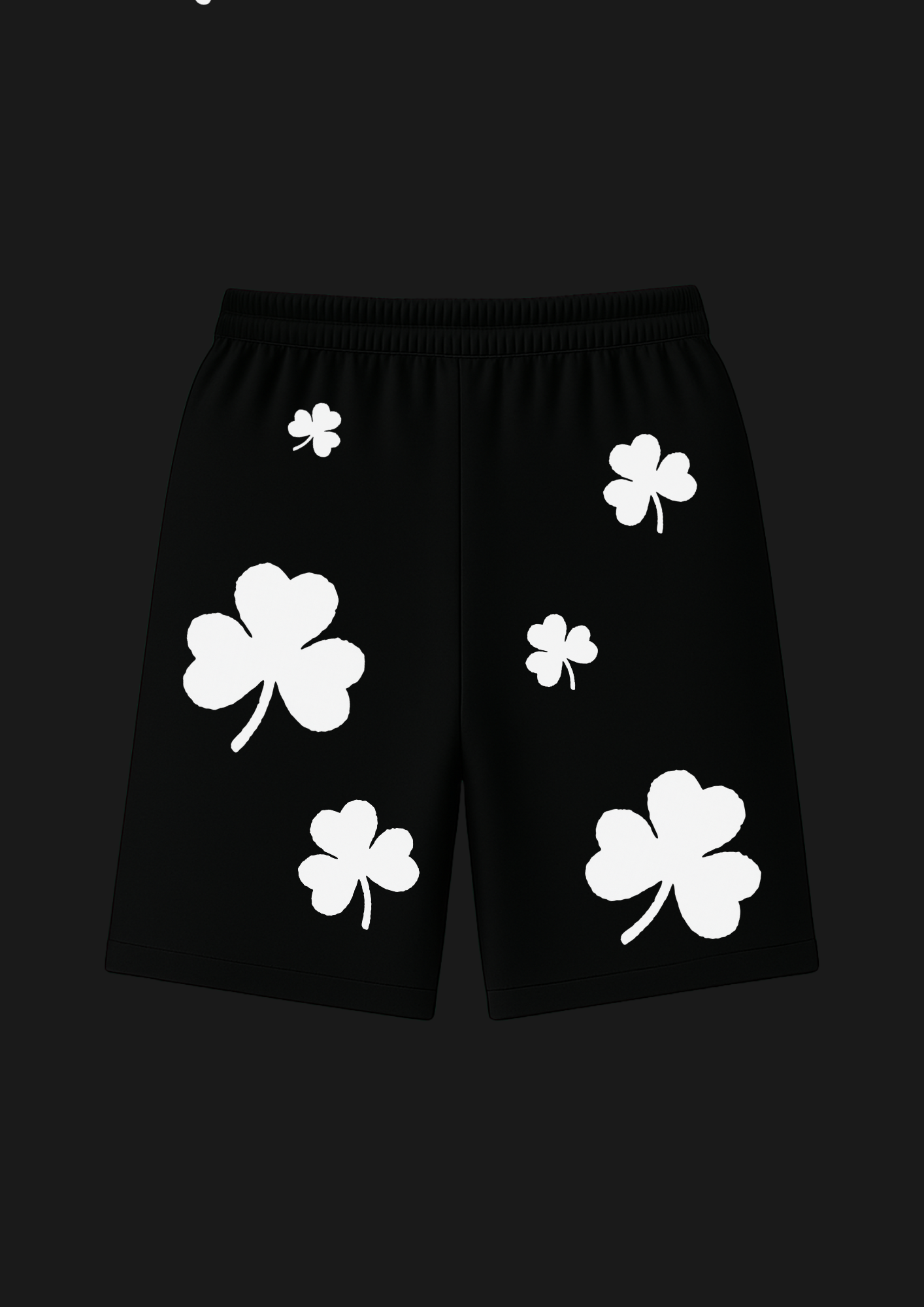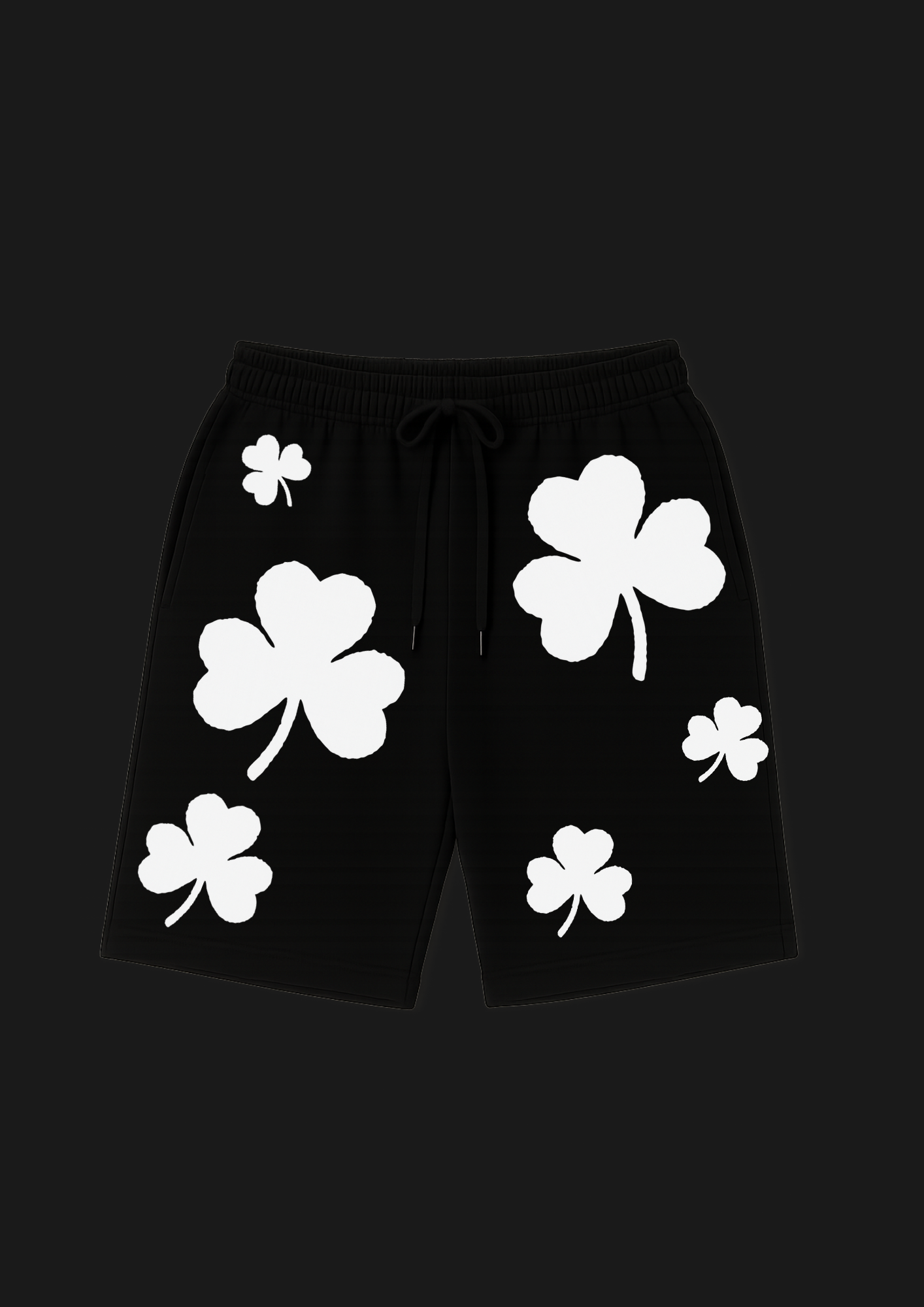 Exklusive Shorts in Schwarz mit weißen Kleeblättern.